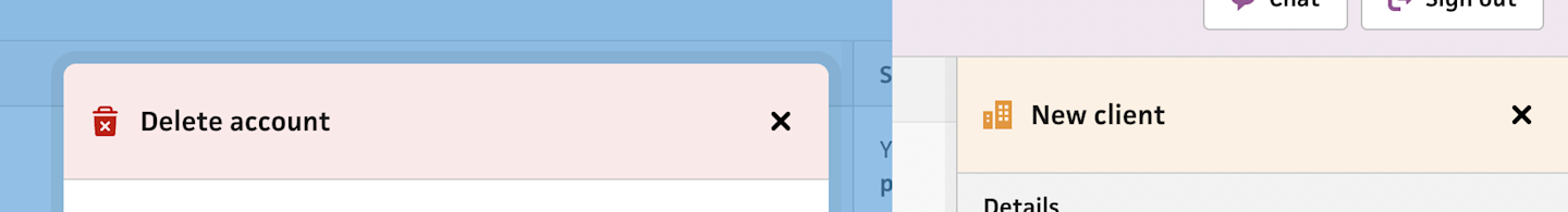Next, I tackled the inline form’s container, which slides into view as the user requests to create a client inline. This behavior is essentially the same as my existing modal window system, but with a different transition and layout. Because of this, I realized I could extract the concept of a “modal” from meaning “a centered window with a dimmed background” to simply “a window with a dimmed background”.