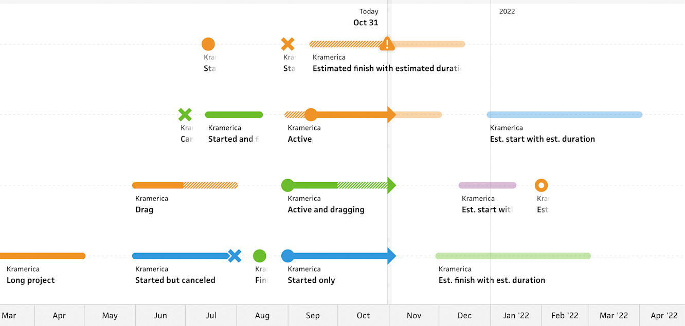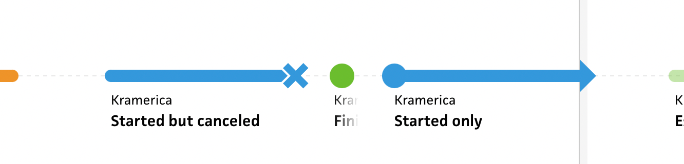 The most noticeable issue is handling labels that exceed the width of the project. To get around this, I considered including the label width in the project width when laying out the projects in rows, so nothing overlaps, but I didn’t think this would look right visually. I needed a solution that could scale from single-day projects to multi-year projects. It didn’t take long before I landed on cropping. Now that the timeline is larger, I have more room to work with, but I also have bigger shapes to work with, too. For example, because the new timeline dots (used for dates) are 24px in diameter (instead of 10px), projects are guaranteed a minimum width of 24px. Even if I crop a label down to 24px, that’s a decent amount of room to hint at the project, but I can’t just do a hard cut.