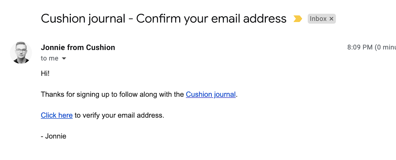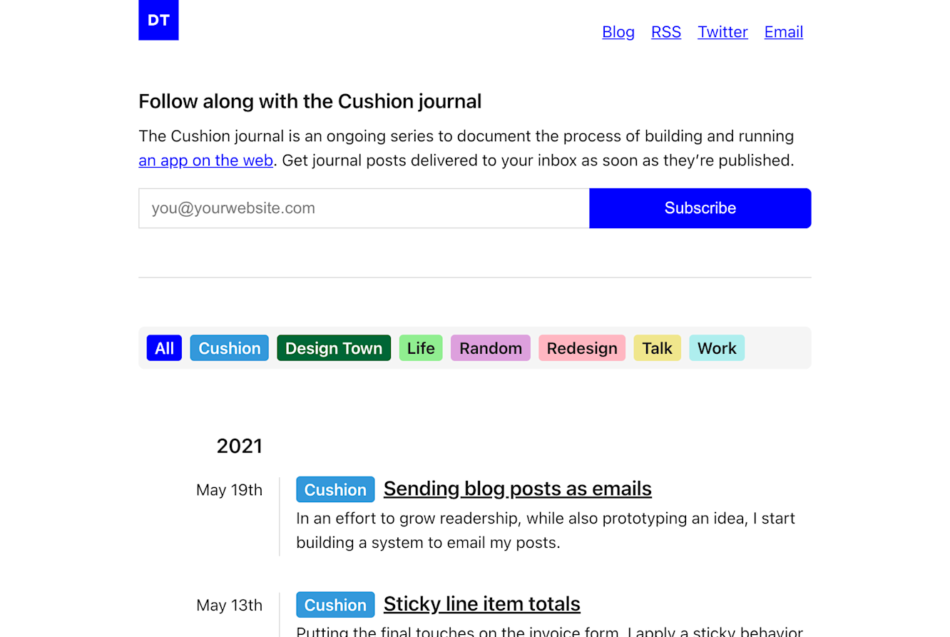 To acquire new subscribers, I started with a form on my blog and another one at the end of Cushion posts. These feel like the most intuitive spots, if someone were to land on my blog or if they finished reading a post. I’m curious which one will be more effective, so eventually, I’d like to add a database column for where folks subscribe from.